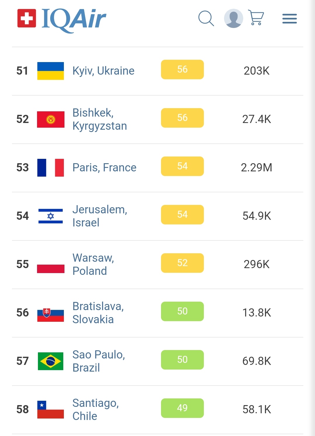 В рейтинге крупнейших городов мира по качеству воздуха World Air Quality Бишкек опустился на 52-е место.