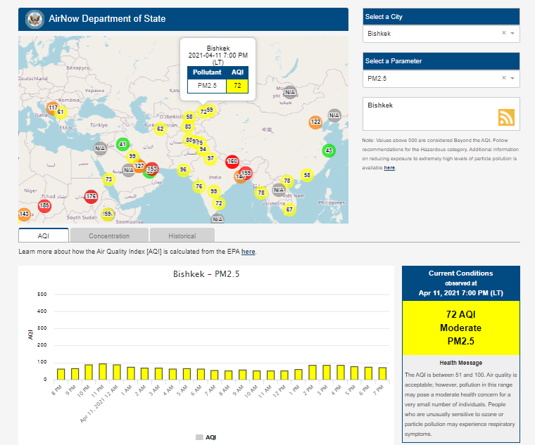 Посольство США в Кыргызстане также установило датчик. Информация обновляется каждый час. На 19.00 индекс качества воздуха в районе дипломатической миссии — 72 (AQI).