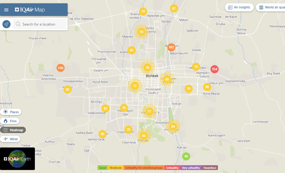 Общественный фонд «Институт экологических решений» установил датчики в столице и пригороде. На карте можно увидеть среднее значение AQI в разных районах Бишкека. Его обновляют ежечасно.