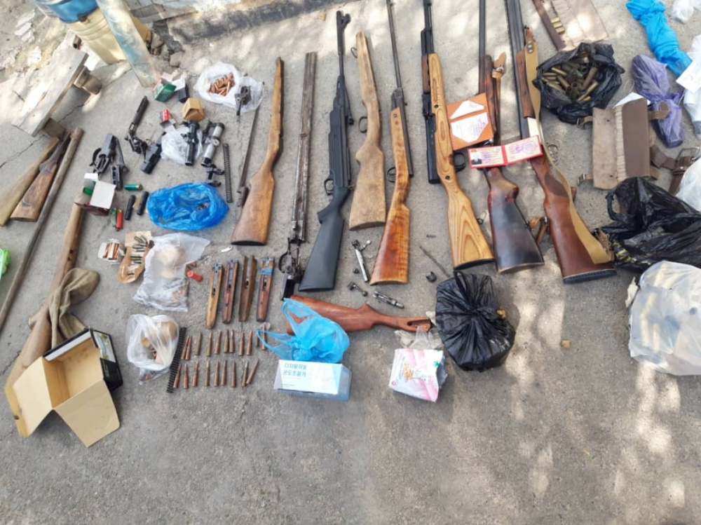 В рамках досудебного производства проведен обыск в доме второго подозреваемого — жителя Аксыйского района Д. Э., 1951 года рождения. Во время обыска обнаружен целый арсенал огнестрельного оружия и боеприпасов: карабин СКС, две мелкокалиберные винтовки ТОЗ-8, две единицы гладкоствольного оружия 16-го и 12-го калибра, а также пневматическое оружие и различные детали боевого оружия. Кроме этого, изъяты боеприпасы — 30 патронов калибра 7,62 миллиметра, 50 патронов калибра 5,45 миллиметра, 37 патронов от мелкокалиберной винтовки, более 40 патронов 16-го и 12-го калибра, более 140 гильз и порох. Разрешительные документы имелись только на одно оружие.