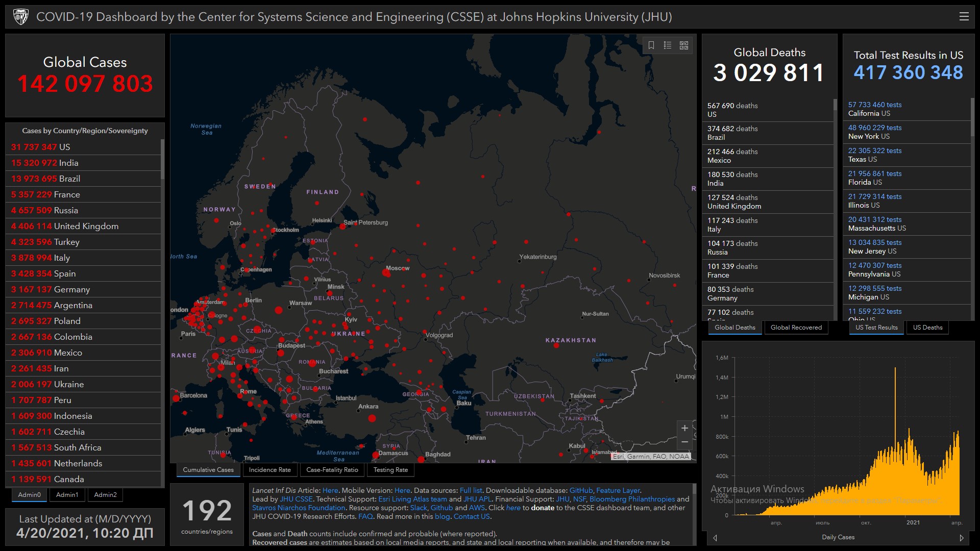 COVID-19 в мире. Заразились более 142 миллионов, умерли более 3 миллионов