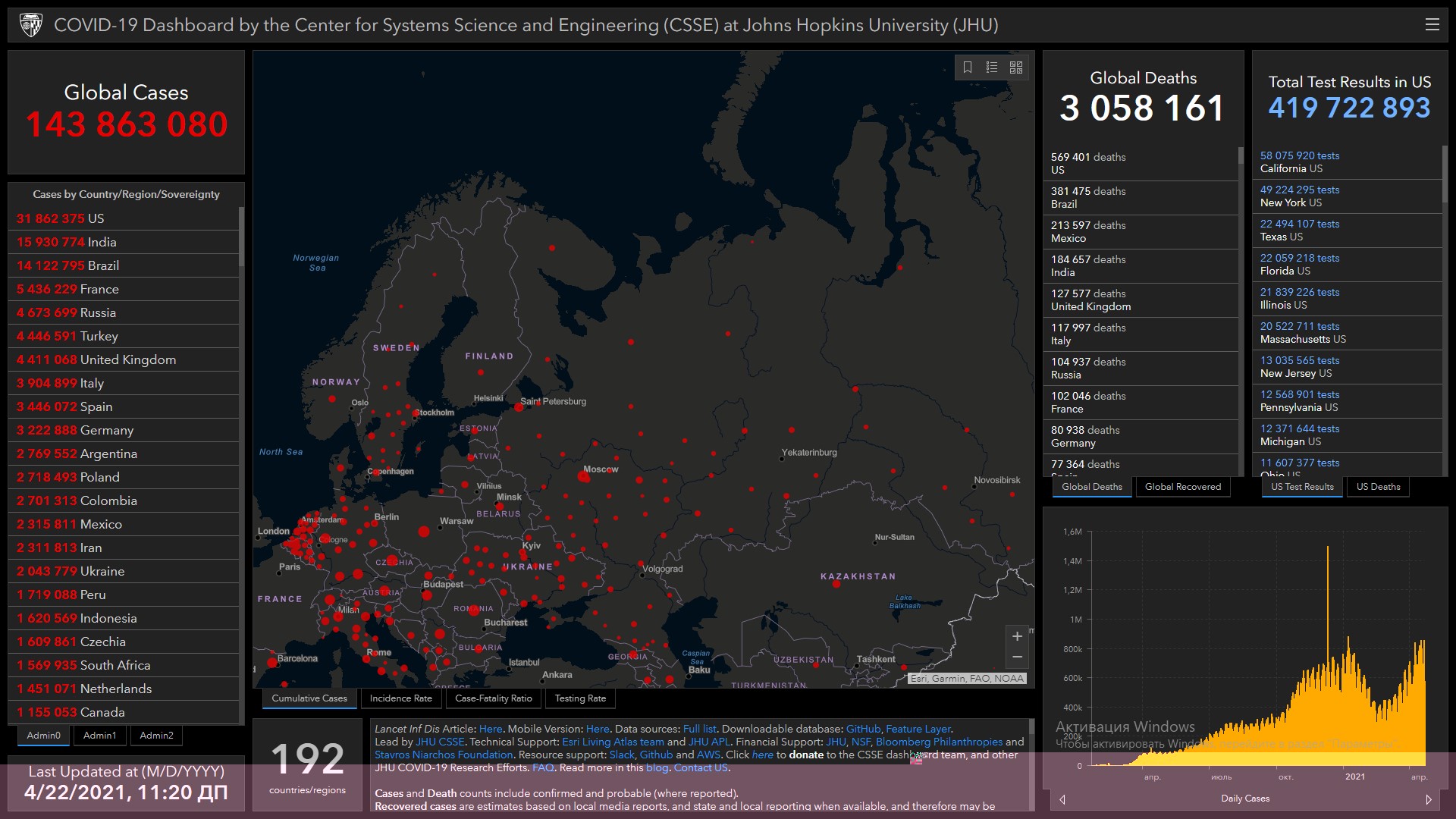 Всего в мире коронавирусом заразились 143 миллиона 863 тысячи 80 человек. Больше всего зараженных в США (31 миллион 862 тысячи 375), Индии (15 миллионов 930 тысяч 774), Бразилии (14 миллионов 122 тысячи 795), Франции (5 миллионов 436 тысяч 229), России (4 миллиона 673 тысячи 699), Турции (4 миллиона 446 тысяч 591), Великобритании (4 миллиона 411 тысяч 68), Италии (3 миллиона 904 тысячи 899), Испании (3 миллиона 446 тысяч 72), Германии (3 миллиона 222 тысячи 888), Аргентине (2 миллиона 769 тысяч 552), Польше (2 миллиона 718 тысяч 493) и Колумбии (2 миллиона 701 тысяча 313).