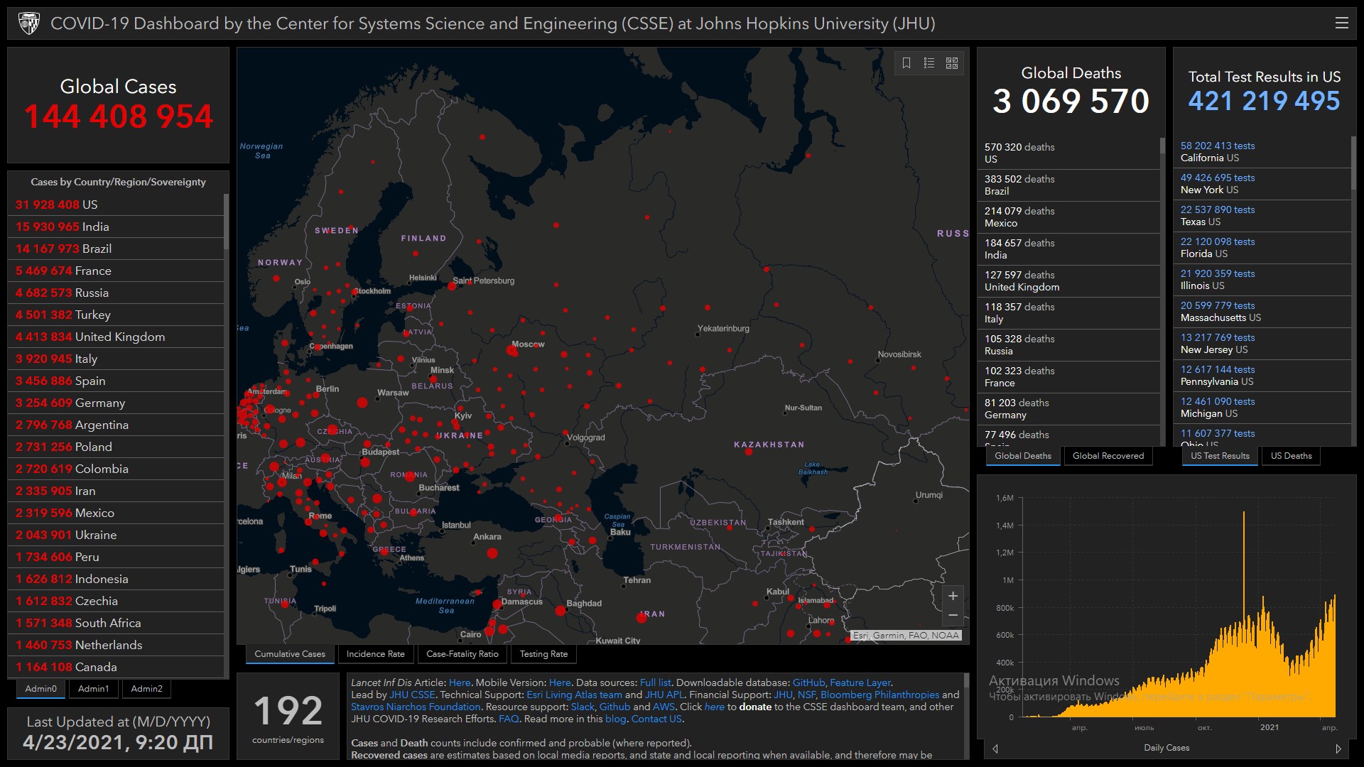 Всего в мире коронавирусом заразились 144 миллиона 408 тысяч 954 человека. Больше всего зараженных в США (31 миллион 928 тысяч 408), Индии (15 миллионов 930 тысяч 965), Бразилии (14 миллионов 167 тысяч 973), Франции (5 миллионов 469 тысяч 674), России (4 миллиона 682 тысячи 583), Турции (4 миллиона 501 тысяча 382), Великобритании (4 миллиона 413 тысяч 834), Италии (3 миллиона 920 тысяч 945), Испании (3 миллиона 456 тысяч 886), Германии (3 миллиона 254 тысячи 609), Аргентине (2 миллиона 796 тысяч 768), Польше (2 миллиона 731 тысяча 256) и Колумбии (2 миллиона 720 тысяч 619).