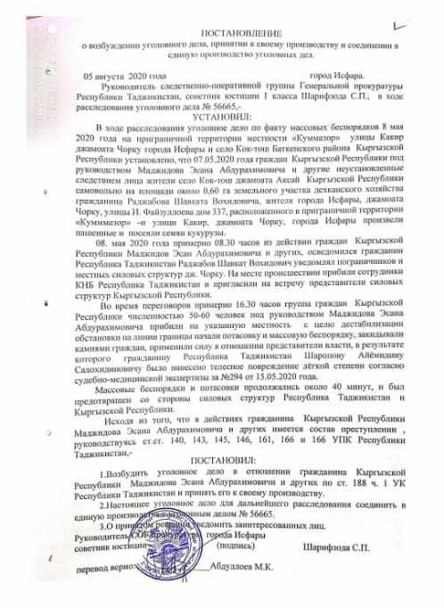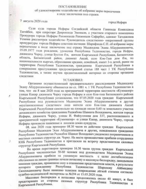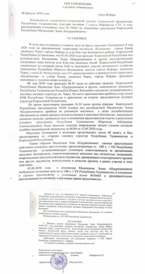 По их словам, в Таджикистане возбуждено уголовное по факту конфликта на границе 8 мая 2020 года. Эсена Мажитова обвиняют в участии в массовых беспорядках.
