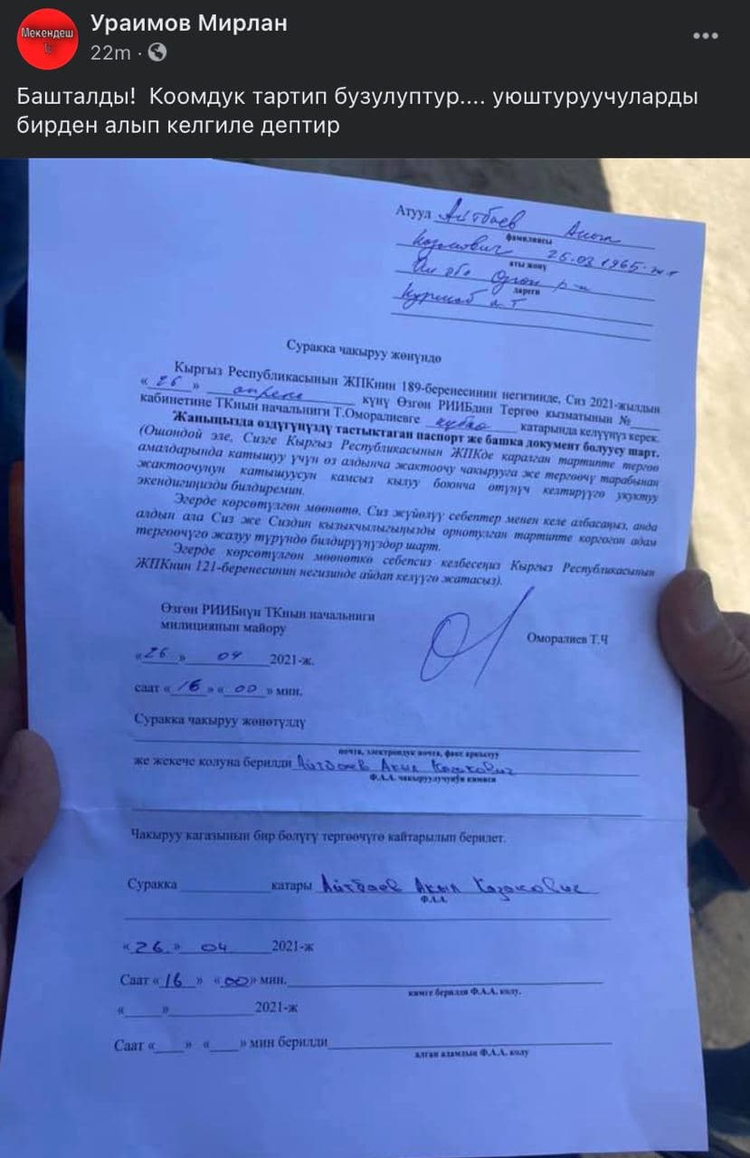 Участники нападения на журналиста, произошедшего во время митинга в Узгенском районе против передачи водохранилища Кемпир-Абад Узбекистану, вызваны на допрос. Информацию 24-kg.com подтвердил пресс-секретарь УВД Ошской области Женишбек Аширбаев.