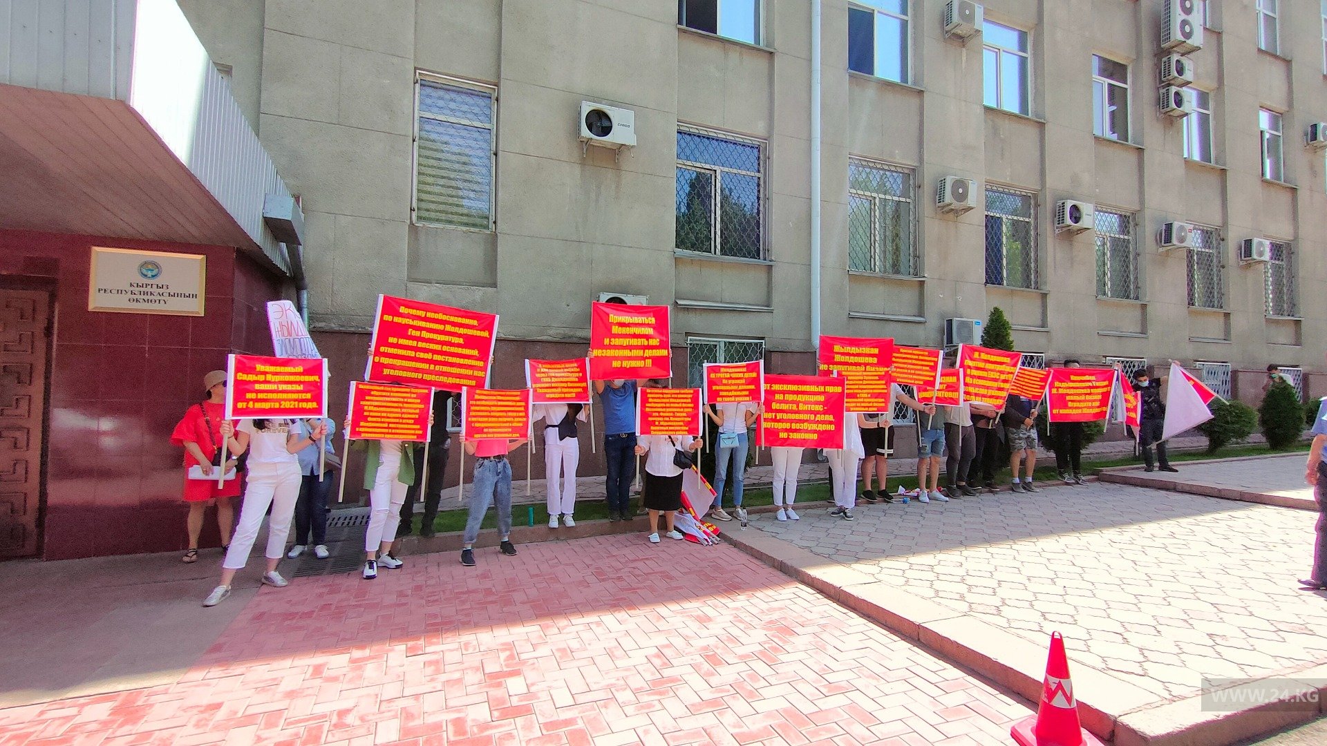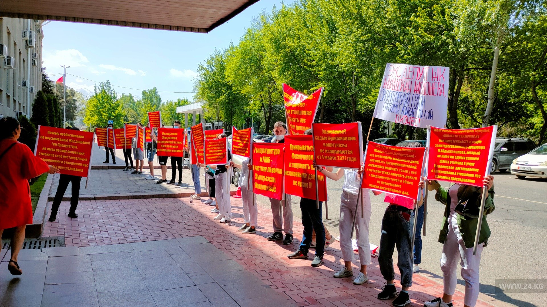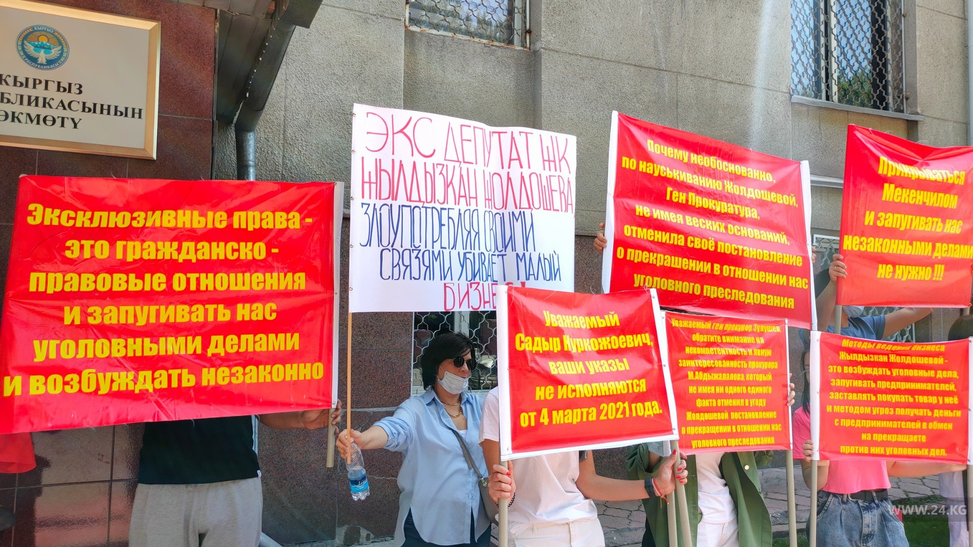 Они держат плакаты с надписями: «Почему прокуратура вместо защиты интересов малого бизнеса занимается гонением?», «Жылдызкан Джолдошова кошмарит малый бизнес, оградите нас от ее нападок».