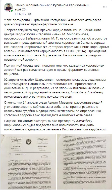 По словам адвоката, 1 апреля врачом-кардиологом из Национального центра кардиологии и терапии имени М.Миррахимова профессором М.Бейшенкуловым на основании жалоб и осмотра выставлен предварительный диагноз: коронарная болезнь сердца, стенокардия напряжения ФК 2, атеросклероз, кальциноз коронарных артерий, ишемическая кардиомиопатия СНФК (NYHA), преходящая артериальная гипотония, торакальгия. Не исключается синдром позвоночной артерии.