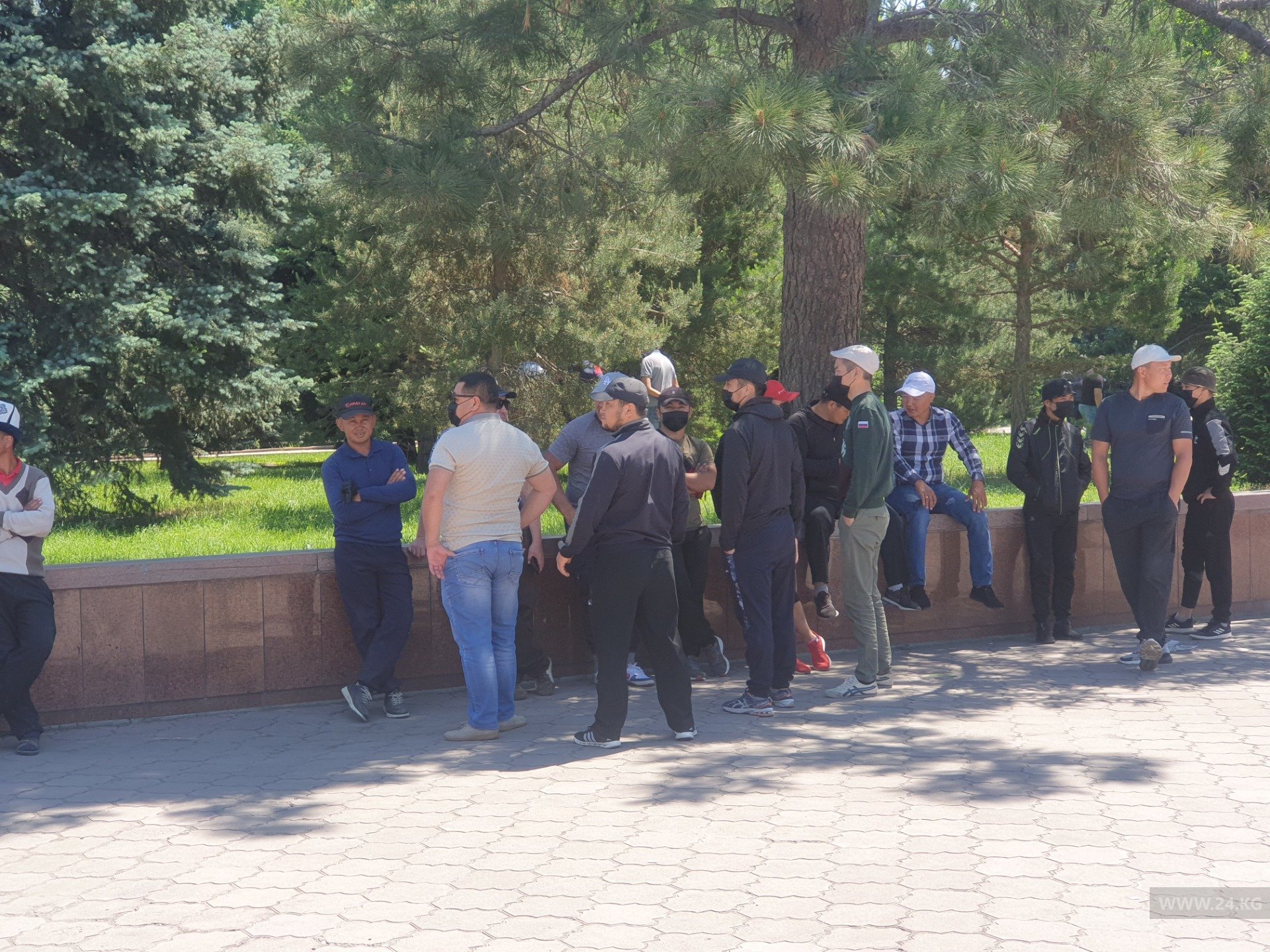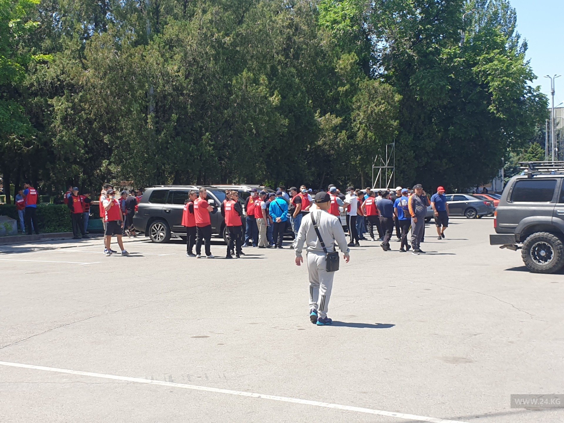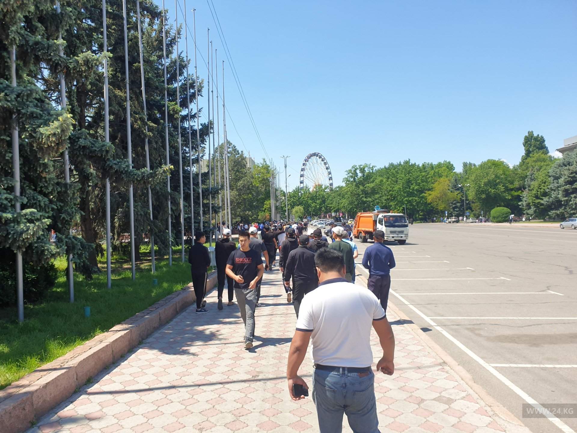 Улица Абдымомунова открыта для проезда машин. Собравшиеся расходятся. Охрану общественного порядка обеспечивают дружинники и милиционеры.