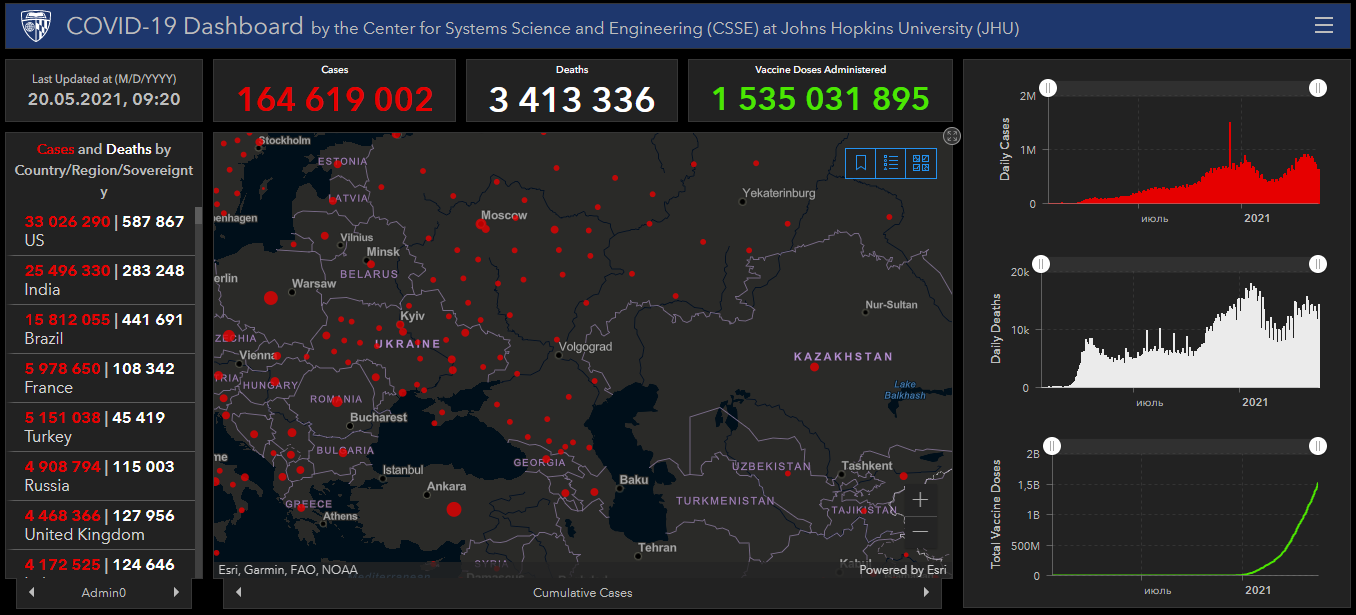 Всего в мире коронавирусом заразились 164 миллиона 619 тысяч 2 человека. Больше всего зараженных в США (33 миллиона 26 тысяч 290), Индии (25 миллионов 496 тысяч 330), Бразилии (15 миллионов 812 тысячи 55), Франции (5 миллионов 978 тысяч 650), Турции (5 миллионов 151 тысяча 38), России (4 миллиона 908 тысяч 494), Великобритании (4 миллиона 468 тысяч 366), Италии (4 миллиона 172 тысячи 525), Германии (3 миллиона 627 тысяч 777), Испании (3 миллиона 625 тысяч 928), Аргентине (3 миллиона 411 тысяч 160), Колумбии (3 миллиона 161 тысяча 126) и Польше (2 миллиона 859 тысяч 261).