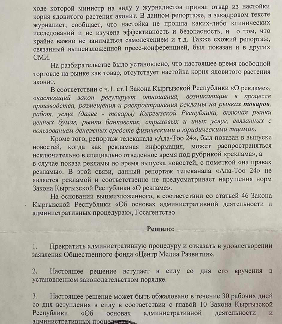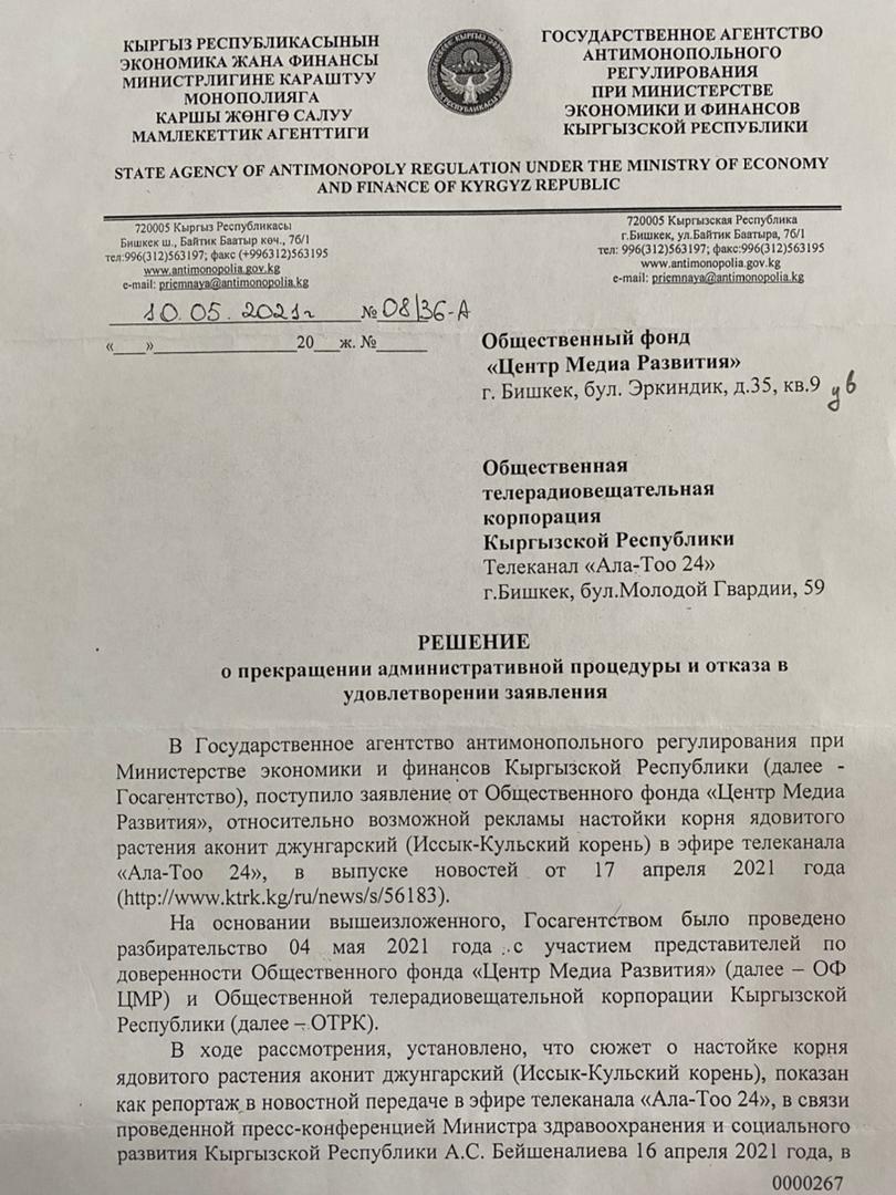 Госагентство антимонопольного регулирования отказало в удовлетворении заявления юристов Центра Медиа Развития в привлечении к ответственности редакции телеканала «Ала-Тоо 24» ОТРК за рекламу ядовитого вещества на основе иссык-кульского корня (аконита). Об этом сообщили в организации.
