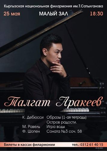 В Малом зале состоится сольный концерт выпускника Российской академии музыки имени Гнесиных, лауреат международных конкурсов Талгата Аракеева. В программе произведения Клода Дебюсси, Мориса Равеля, Фридерика Шопена.