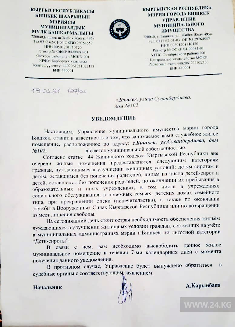 Фото 24-kg.com. Уведомление о выселении