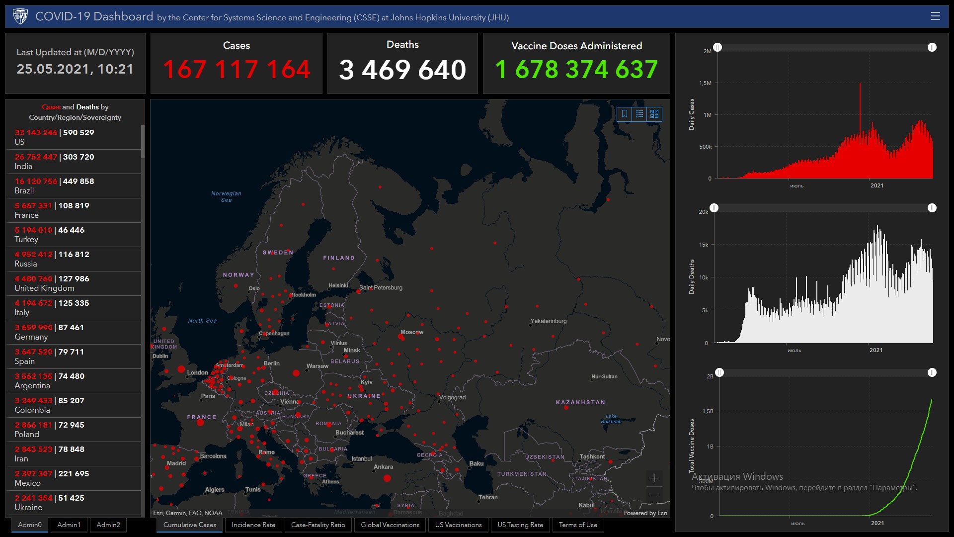 Всего в мире коронавирусом заразились 167 миллионов 117 тысяч 164 человека. Больше всего зараженных в США (33 миллиона 143 тысячи 246), Индии (26 миллионов 752 тысячи 447), Бразилии (16 миллионов 120 тысяч 756), Франции (5 миллионов 667 тысяч 331), Турции (5 миллионов 194 тысячи 10), России (4 миллиона 952 тысячи 412), Великобритании (4 миллиона 480 тысяч 760), Италии (4 миллиона 194 тысячи 672), Германии (3 миллиона 659 тысяч 990), Испании (3 миллиона 647 тысяч 520), Аргентине (3 миллиона 562 тысячи 135), Колумбии (3 миллиона 249 тысяч 433) и Польше (2 миллиона 866 тысяч 181).