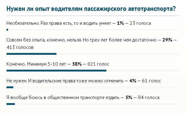 Больше половины проголосовавших (58 процентов) считают: допускать к пассажирским перевозкам необходимо водителей с профессиональным стажем 5-10 лет. 29 процентов респондентов уверены, что трехлетнего опыта более чем достаточно. 5 процентов проголосовавших признались, что вообще боятся передвигаться в общественном транспорте. Еще 4 процента ответили: «Стаж не нужен, водительские права тоже можно отменить».