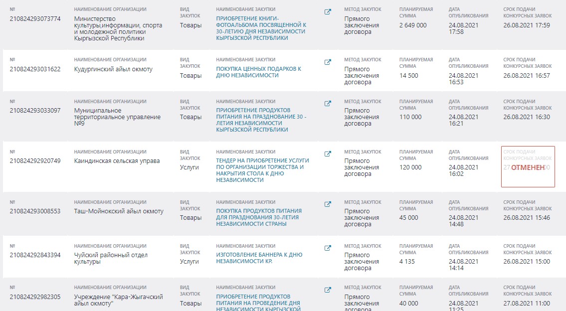 Помимо этого, тендеры, связанные с проведением Дня независимости, объявили и акимиаты столицы.