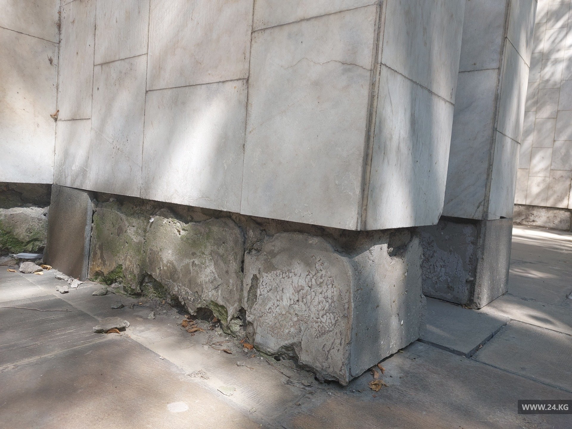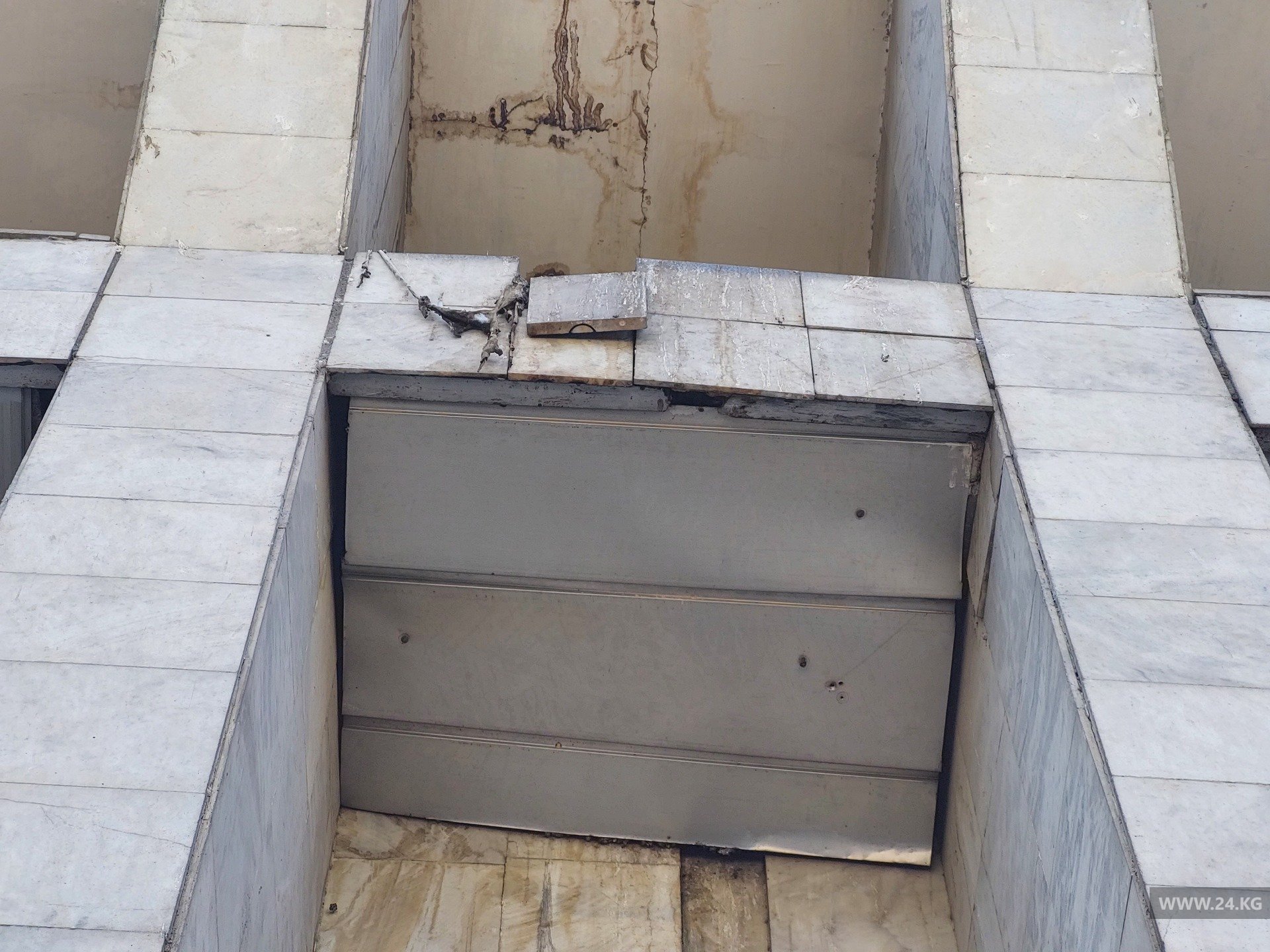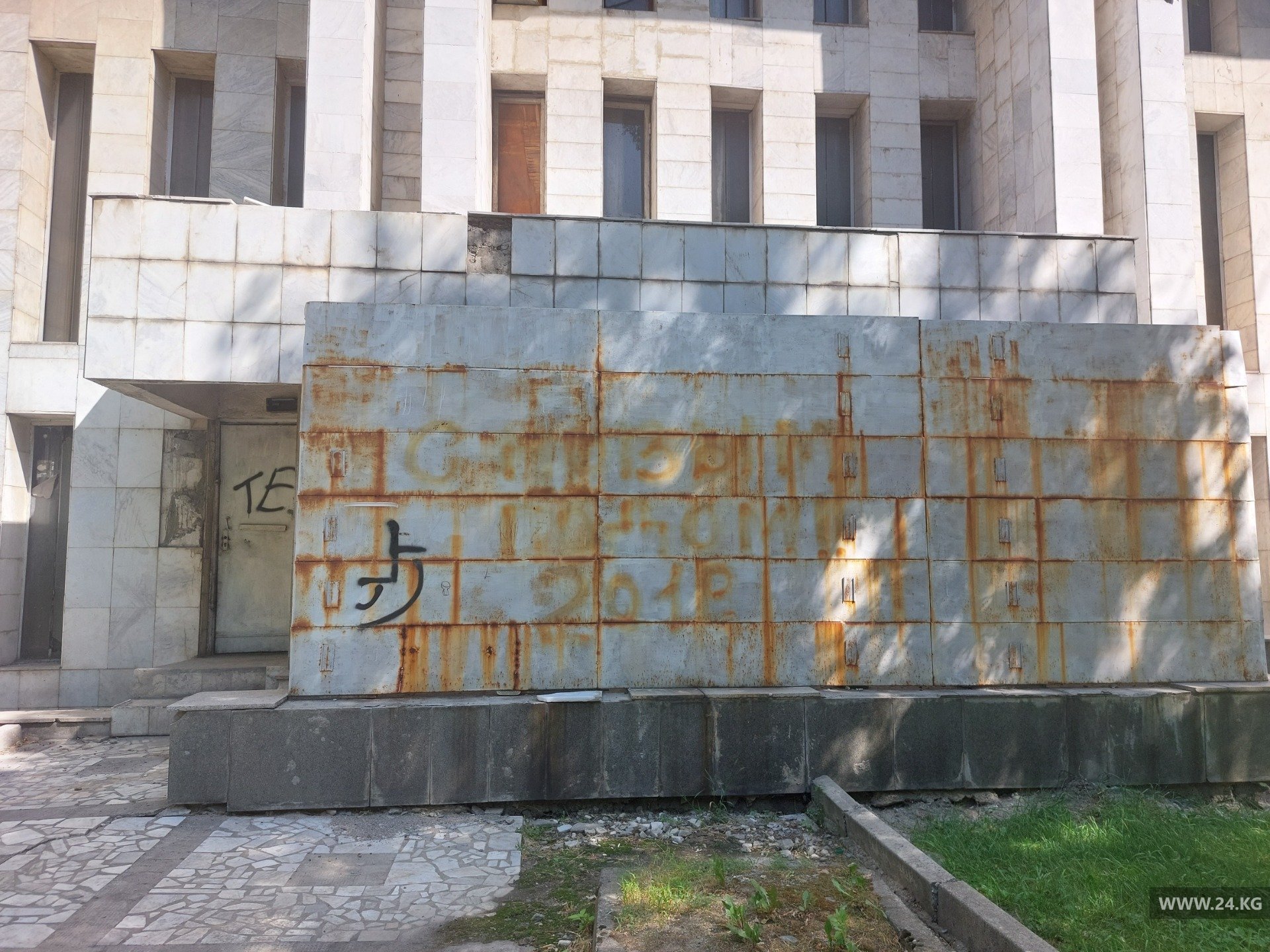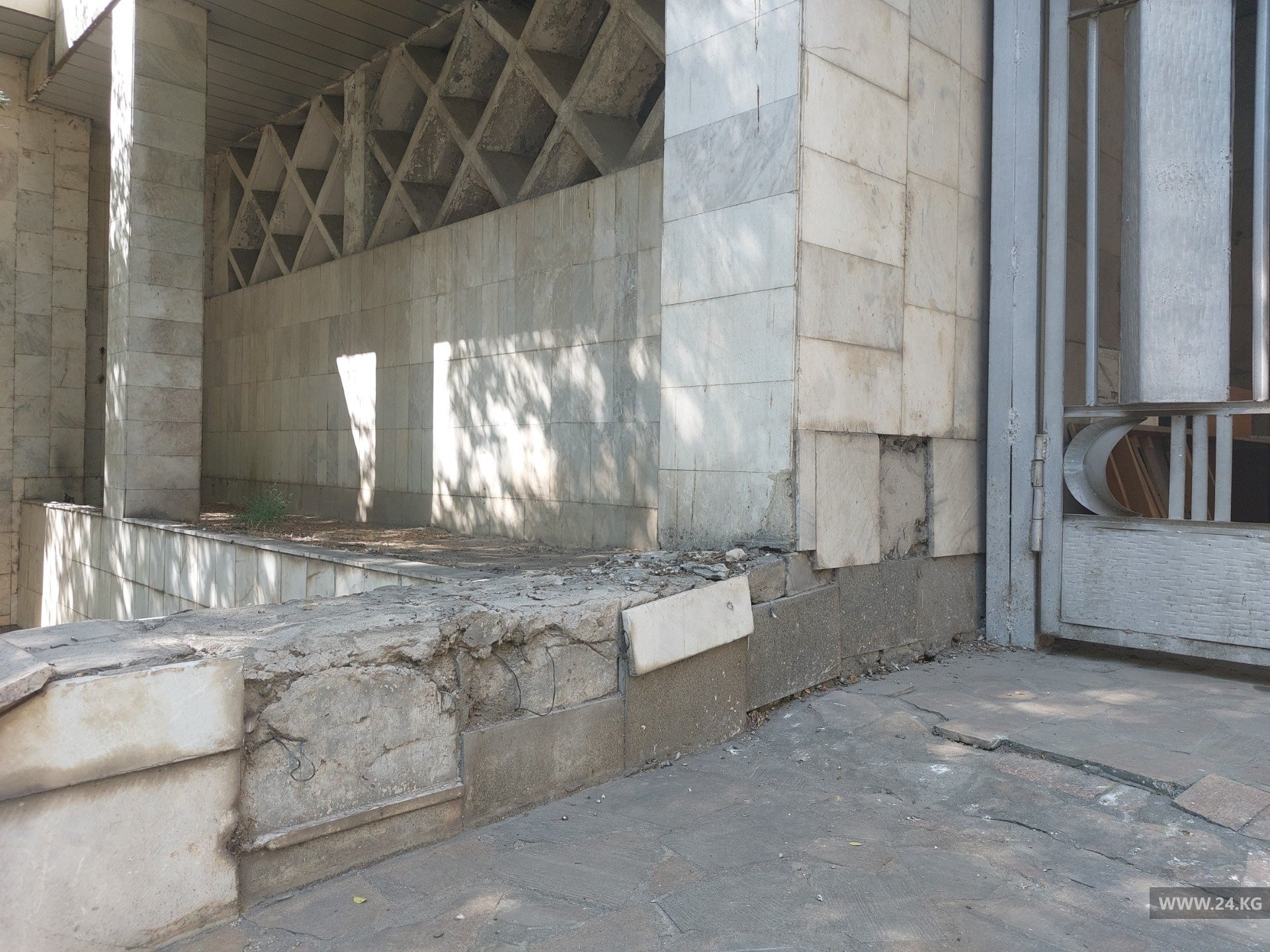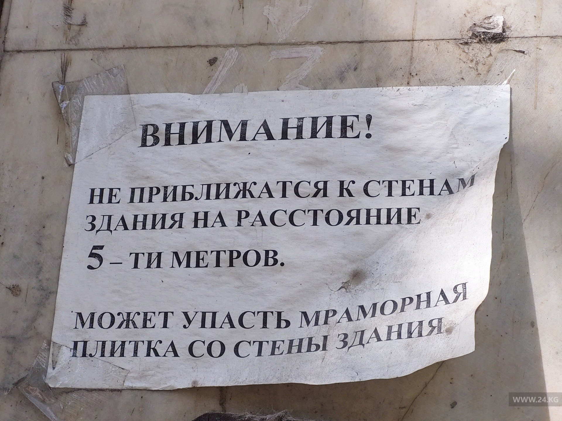 Находиться рядом со зданием Национальной библиотеки имени Алыкула Осмонова может быть опасно. Администрация учреждения просит горожан не подходить к его стенам ближе чем на пять метров — может упасть мраморная плитка. Предостережения расклеены по всему периметру здания.
