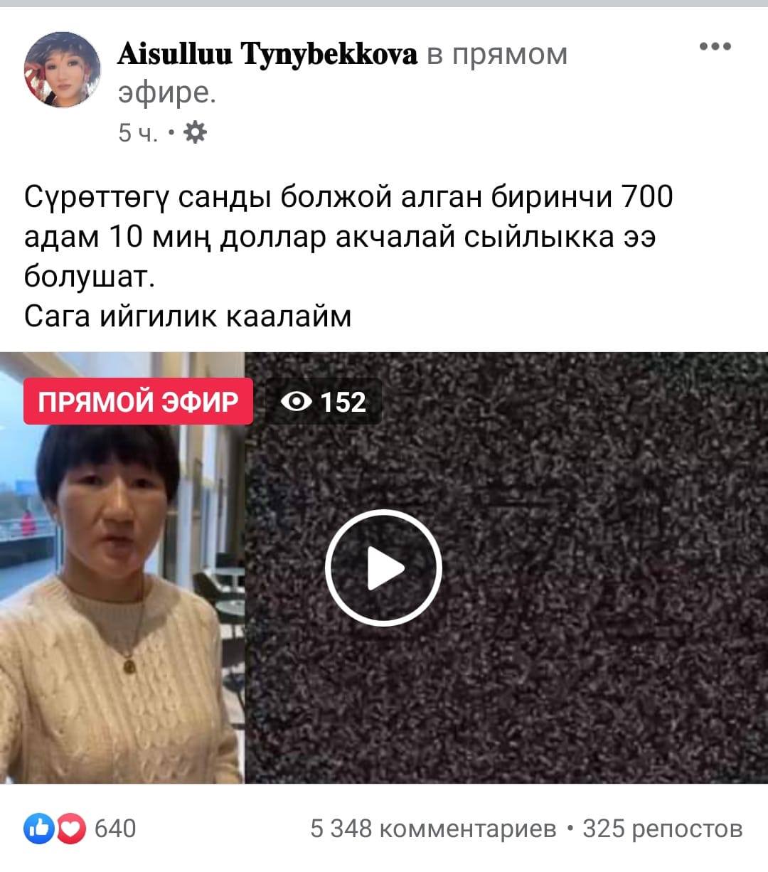 В связи с этим Айсулуу Тыныбекова призвала кыргызстанцев пожаловаться на фейковую страницу Aisulluu Tynybekkova в Facebook, перейдя по ссылке.