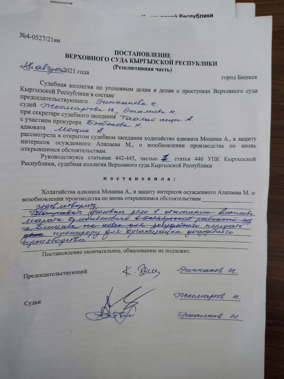 В пресс-службе Верховного суда подтвердили, что 18 августа 2021 года судебная коллегия по уголовным рассмотрела ходатайство адвоката Александра Мощина и заключение прокурора о необходимости возобновления производства по уголовному делу из-за вновь открывшихся обстоятельств в отношении Марата Алапаева.