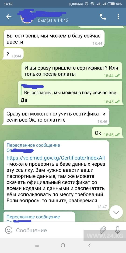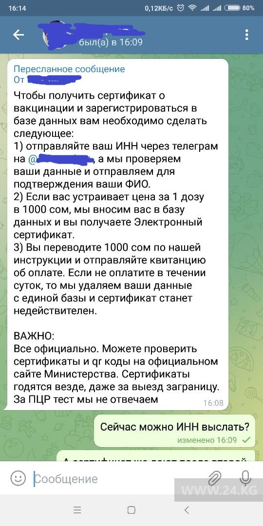 Корреспондент 24.kg связалась с таким профилем. Отправила ИНН невакцинированного человека, через 1,5 часа взамен прислали его ФИО и уточнили, согласны ли мы ввести в базу. Еще через несколько минут сертификат был готов на сайте vc.emed.gov.kg. Причем бесплатно! Указано ФИО человека, название вакцины, ее серия, все как положено.
