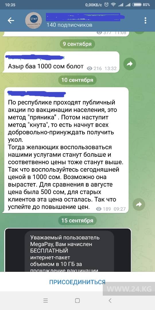 «Сейчас вакцинируют методом пряника, потом наступит метод кнута и начнут всех принуждать получить укол. Тогда желающих воспользоваться нашими услугами станет больше, и, соответственно, цены тоже станут выше. Успейте до повышения цен!» — призывают кыргызстанцев авторы Telegram-канала.