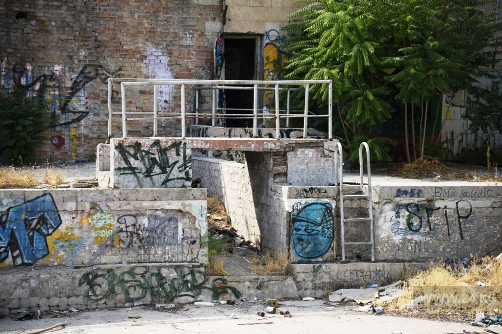 Не выдержала испытаний временем и алчностью и вся его инфраструктура. Насосы, фильтры и коммуникации — одна из самых важных и дорогих составляющих любого бассейна, уничтожены. Даже многотонная лестница, ведущая на трибуны с улицы, сегодня представляет угрозу. Того и гляди обрушится на припаркованные внизу машины. Дирекция поставила внизу блоки, чтобы избежать возможной трагедии, но все равно находятся те, кто ухитряется между ними припарковаться.