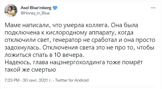 Отметим, в соцсетях обсуждается случай со смертью женщины. Одна из пользовательниц Twitter написала: «Маме написали, что умерла коллега. Она была подключена к кислородному аппарату. Когда отключили свет, генератор не сработал и она просто задохнулась. Отключение света — это не про то, чтобы ложиться спать в 22.00».