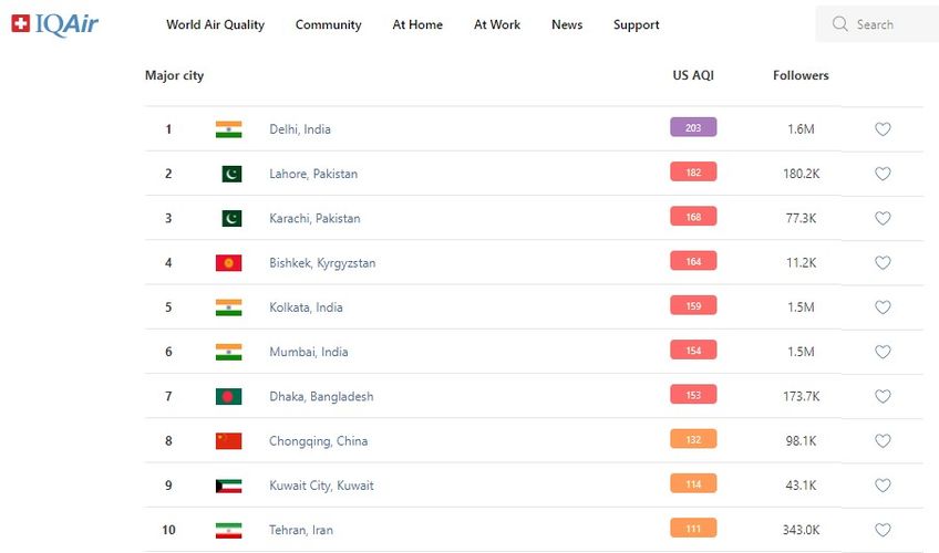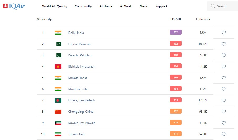В рейтинге крупнейших городов мира по качеству воздуха World Air Quality Бишкек находится на четвертом месте.