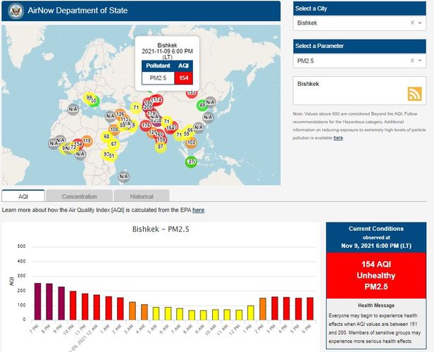 Посольство США в Кыргызстане также установило датчик. Информация обновляется каждый час. Индекс качества воздуха в районе дипломатической миссии «умеренный» — 154 (AQI).
