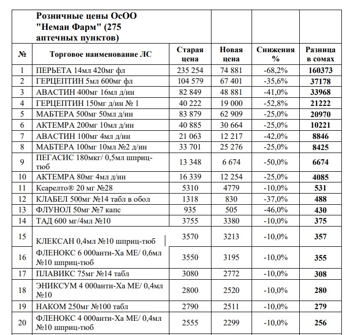 По целому перечню лекарственных средств цены были завышены в два раза. Так, препарат «Перьета» до снижения цены продавался в розничных аптеках за 235 тысяч 254 сома, после стал стоить 74 тысячи 881 сом. Разница составила 160 тысяч 373 сома. Препарат «Герцептин» продавался по 104 тысячи 579 сомов. Теперь его цена — 67 тысяч 401 сом. Разница 37 тысяч 178 сомов. Цена за «Авастин» доходила до 82 тысяч 849 сомов. После снижения он стал стоить 48 тысяч 881 сом. Разница — 33 тысячи 968 сомов. Всего в списке 500 наименований лекарственных средств.