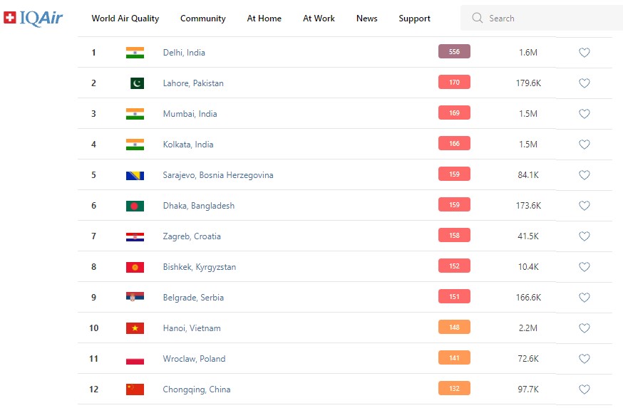 В рейтинге крупнейших городов мира по качеству воздуха World Air Quality Бишкек находится на восьмом месте.