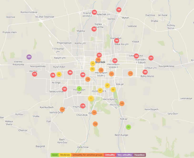 Общественный фонд «Институт экологических решений» установил датчики в столице и пригороде. На карте можно увидеть среднее значение AQI в разных районах Бишкека. Его обновляют ежечасно.