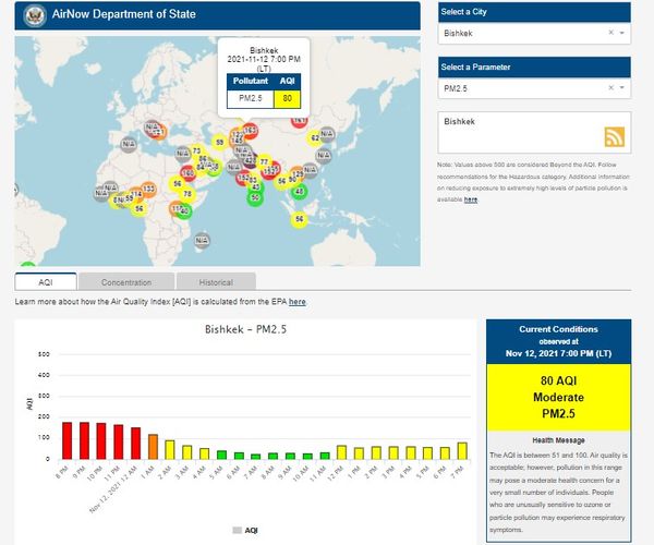 Посольство США в Кыргызстане также установило датчик. Информация обновляется каждый час. Индекс качества воздуха в районе дипломатической миссии «умеренный» — 80 (AQI).