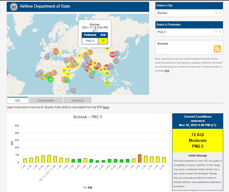 Посольство США в Кыргызстане также установило датчик. Информация обновляется каждый час. Индекс качества воздуха в районе дипломатической миссии «хороший» — 72 (AQI).
