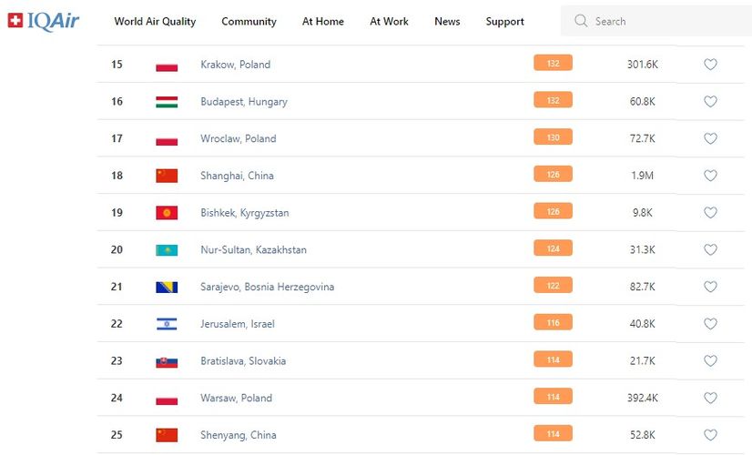В рейтинге крупнейших городов мира по качеству воздуха World Air Quality Бишкек поднялся на 19-е место.