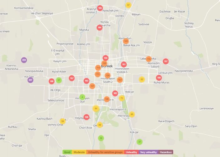 Общественный фонд «Институт экологических решений» установил датчики в столице и пригороде. На карте можно увидеть среднее значение AQI в разных районах Бишкека. Его обновляют ежечасно.