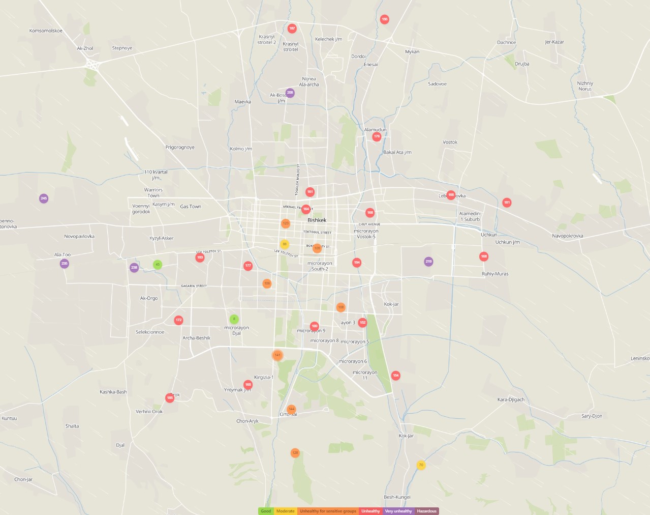 Общественный фонд «Институт экологических решений» установил датчики в столице и пригороде. На карте можно увидеть среднее значение AQI в разных районах Бишкека. Его обновляют ежечасно.