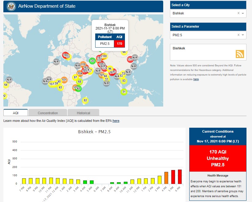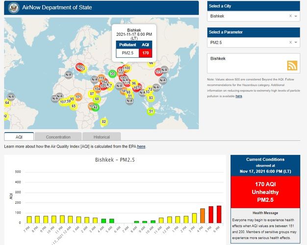 Посольство США в Кыргызстане также установило датчик. Информация обновляется каждый час. Индекс качества воздуха в районе дипломатической миссии «хороший» — 170 (AQI).