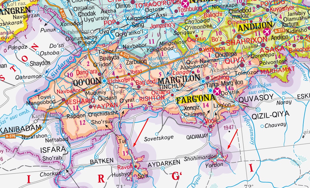На сайте Государственного комитета по земельным ресурсам, геодезии, картографии и государственному кадастру Узбекистана можно скачать политическую и административную карты, где четко указаны Сох, Шахимардан, Чон-Гара и Джангал. Они отделены от территории РУз.