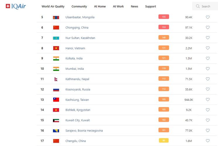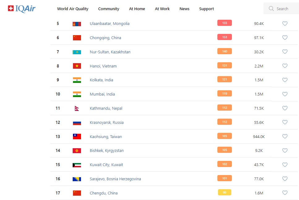 В рейтинге крупнейших городов мира по качеству воздуха World Air Quality Бишкек опустился на 14-е место.
