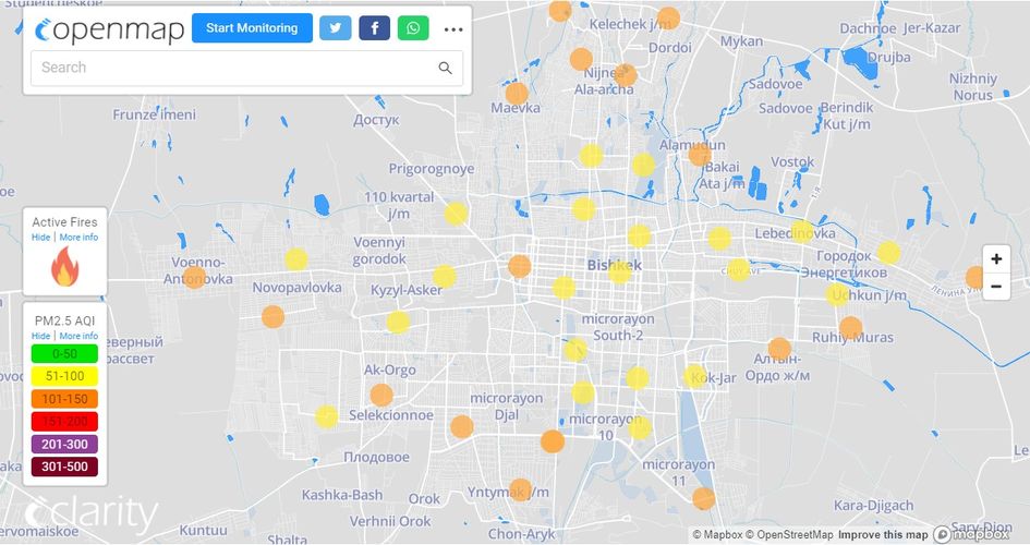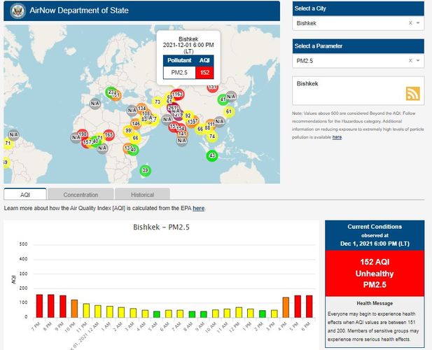 Посольство США в Кыргызстане также установило датчик. Информация обновляется каждый час. Индекс качества воздуха в районе дипломатической миссии — 152 (AQI).