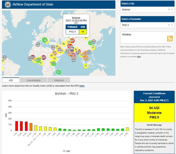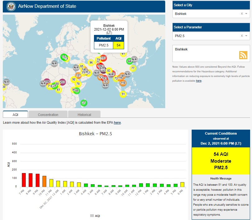 Посольство США в Кыргызстане также установило датчик. Информация обновляется каждый час. Индекс качества воздуха в районе дипломатической миссии — 54 (AQI).
