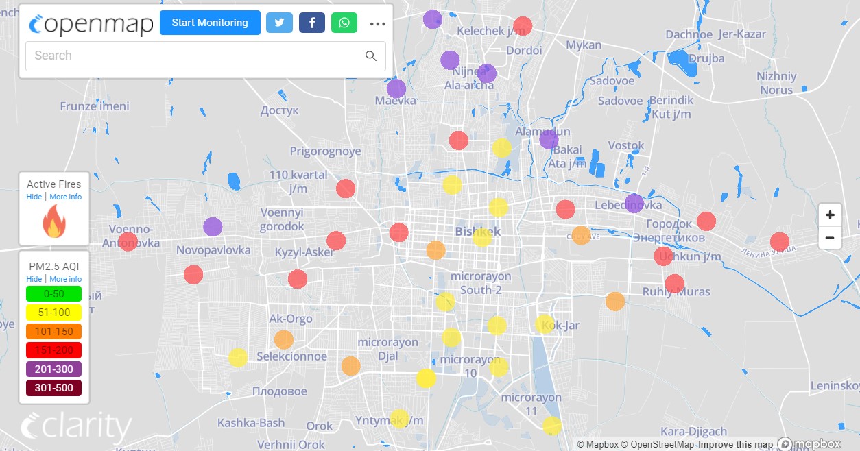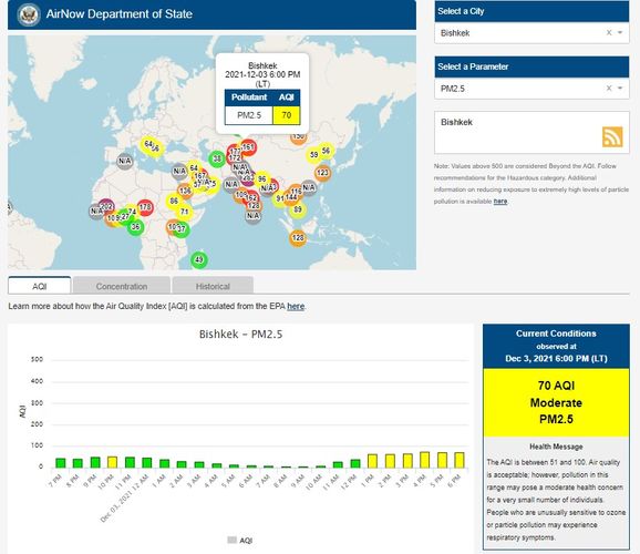 Посольство США в Кыргызстане также установило датчик. Информация обновляется каждый час. Индекс качества воздуха в районе дипломатической миссии — 70 (AQI).