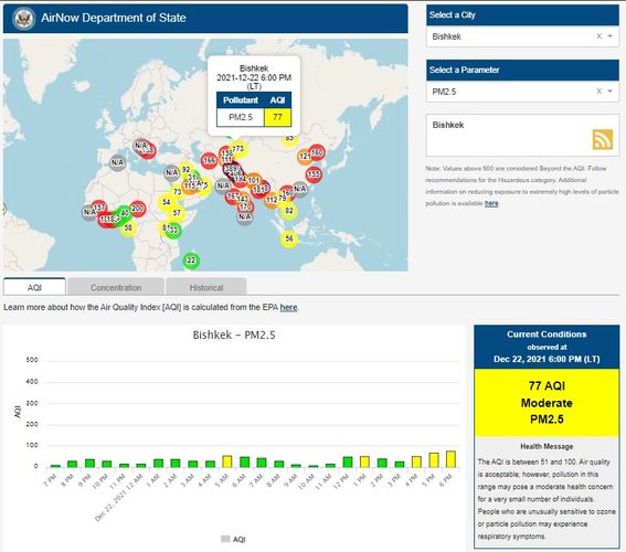 Посольство США в Кыргызстане также установило датчик. Информация обновляется каждый час. Индекс качества воздуха в районе дипломатической миссии — 77 (AQI).