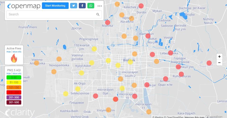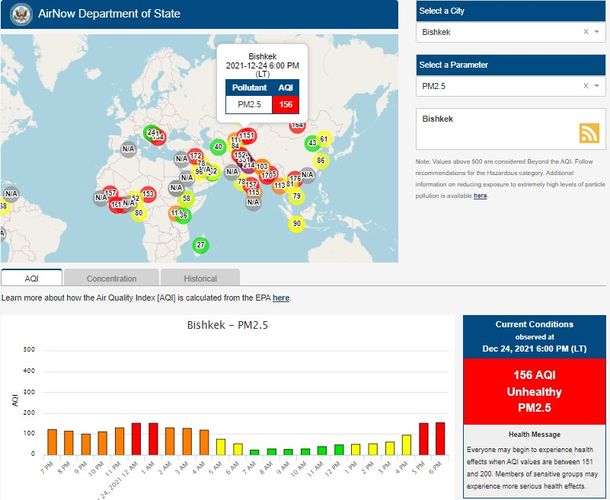 Посольство США в Кыргызстане также установило датчик. Информация обновляется каждый час. Индекс качества воздуха в районе дипломатической миссии — 156 (AQI).