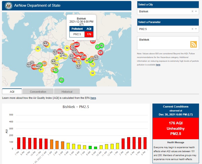 Посольство США в Кыргызстане также установило датчик. Информация обновляется каждый час. Индекс качества воздуха в районе дипломатической миссии — 176 (AQI).