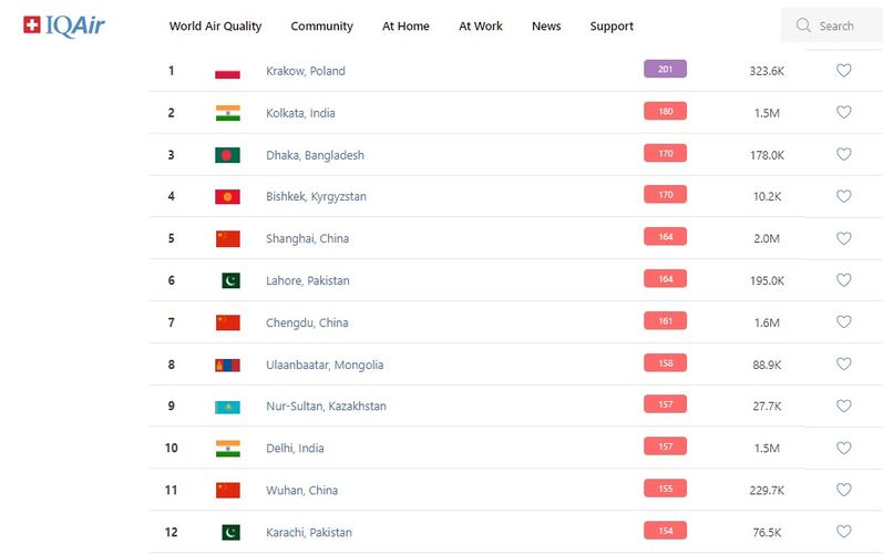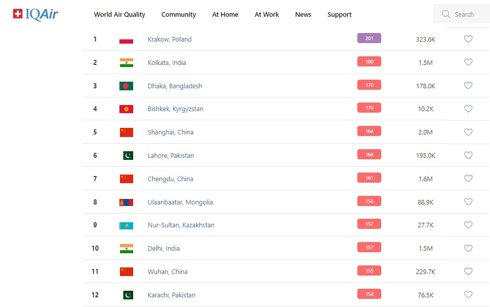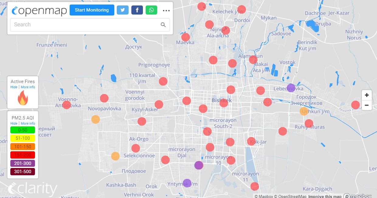 В рейтинге крупнейших городов мира по качеству воздуха World Air Quality Бишкек опустился на 4-е место.