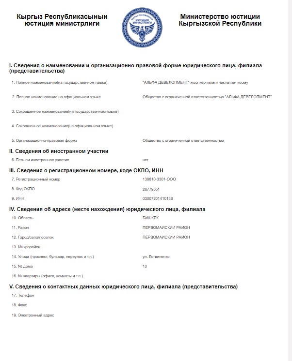 По данным портала «Открытый бюджет» Минфина, за прошлый год «Альфа Девелопмент» оплатила налогов, сборов, арендных платежей на сумму 1 миллион 423 тысячи 674,99 сома.