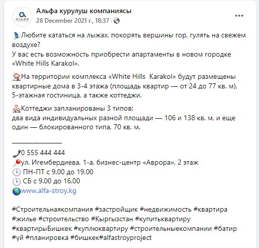 Коттеджный городок в Караколе будет строить компания «Альфа строй». Объявления о возможности приобрести жилье в Karakol White Hills появились 28 декабря 2021 года на ее страницах в социальных сетях.
