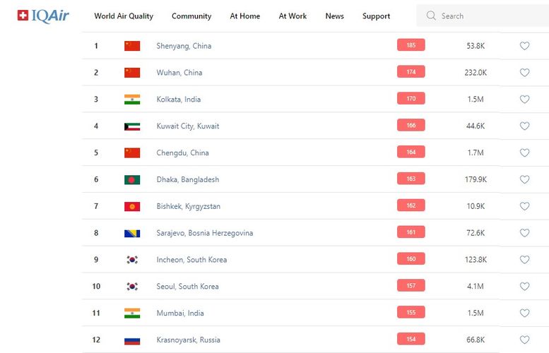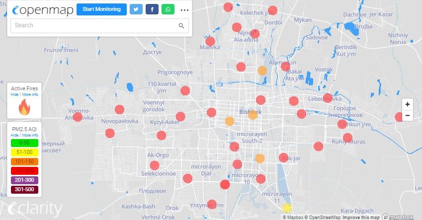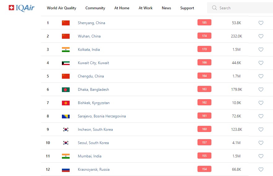 В рейтинге крупнейших городов мира по качеству воздуха World Air Quality Бишкек поднялся на 7-е место.