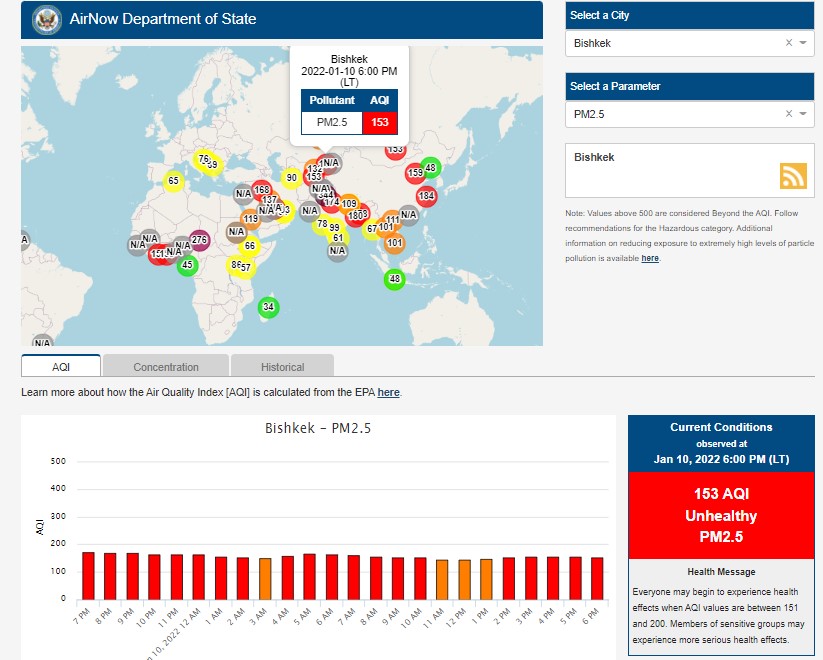 Посольство США в Кыргызстане также установило станцию. Информация обновляется каждый час. Индекс качества воздуха в районе дипломатической миссии — 153 (AQI).